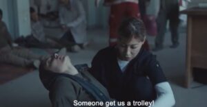 وتجسد سارة يوسف شخصية “فدوى ” تذهب إلى المستشفى على أقدامها بعد القصف، متأثرة بالجراح الشديدة، وتنجح منة شلبي التي تلعب دور طبيبة في غزة في انقاذها وانقاذ جنينها.
