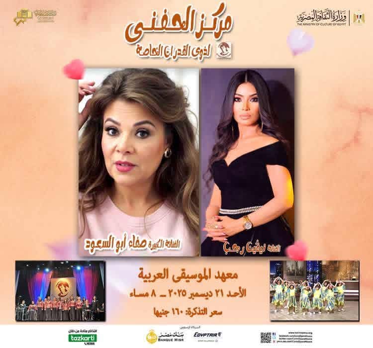 تنظم دار الأوبرا المصرية برئاسة الدكتور علاء عبد السلام حفلاً لمركز الحفنى لذوى القدرات الخاصة بمشاركة النجمة صفاء ابو السعود والفنانة نيفين رجب وذلك فى الثامنة مساء الأحد 21 ديسمبر على مسرح معهد الموسيقى العربية.
